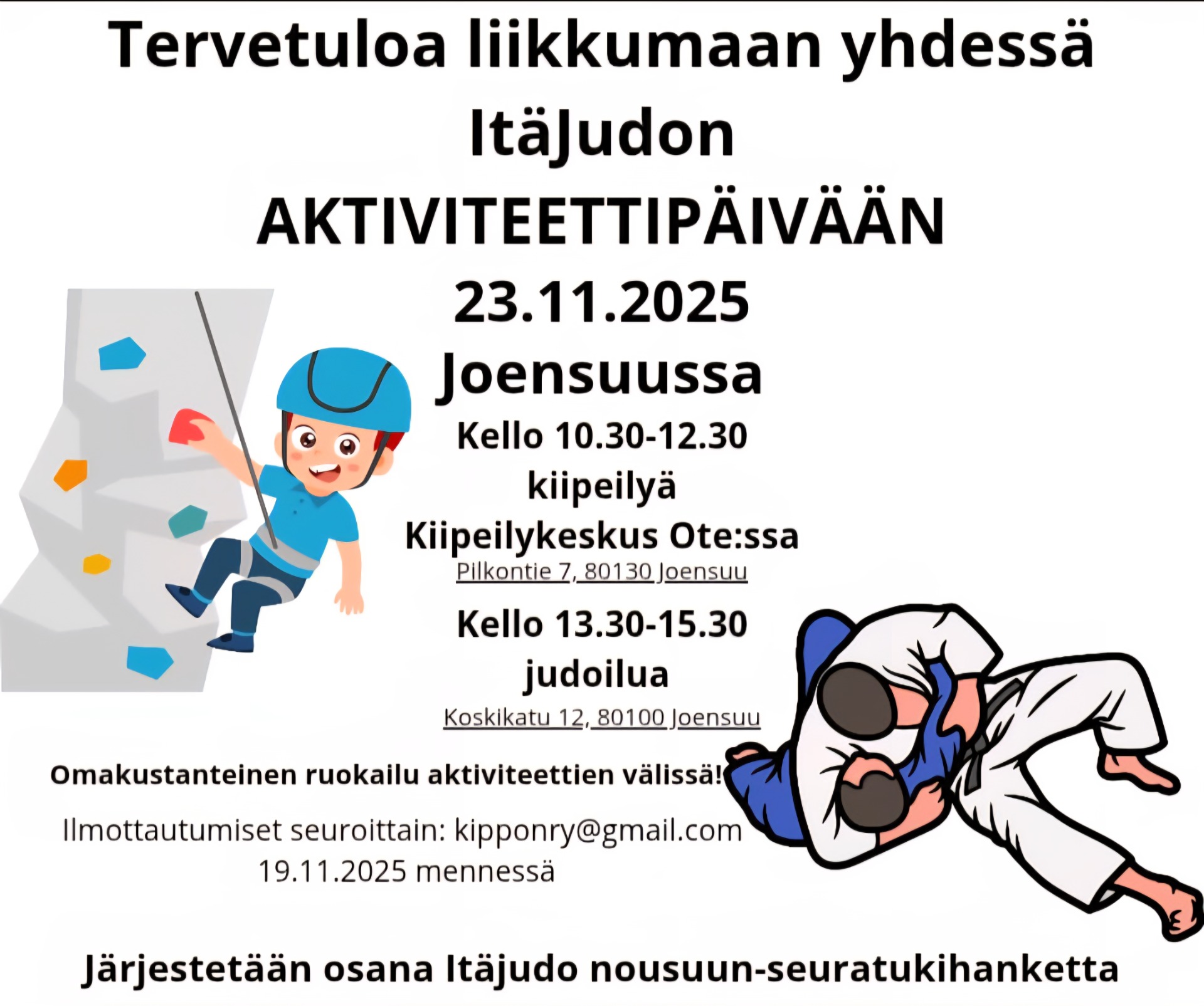 Tervetuloa kaikki seuran juniorit mukaan kiipeilemään, judoilemaan ja viettämään kivaa päivää yhdessä. Tarkempi ohjelma ja aikataulu alla olevassa ilmoituksessa. Ilmoittautumiset omalle valmentajalle.